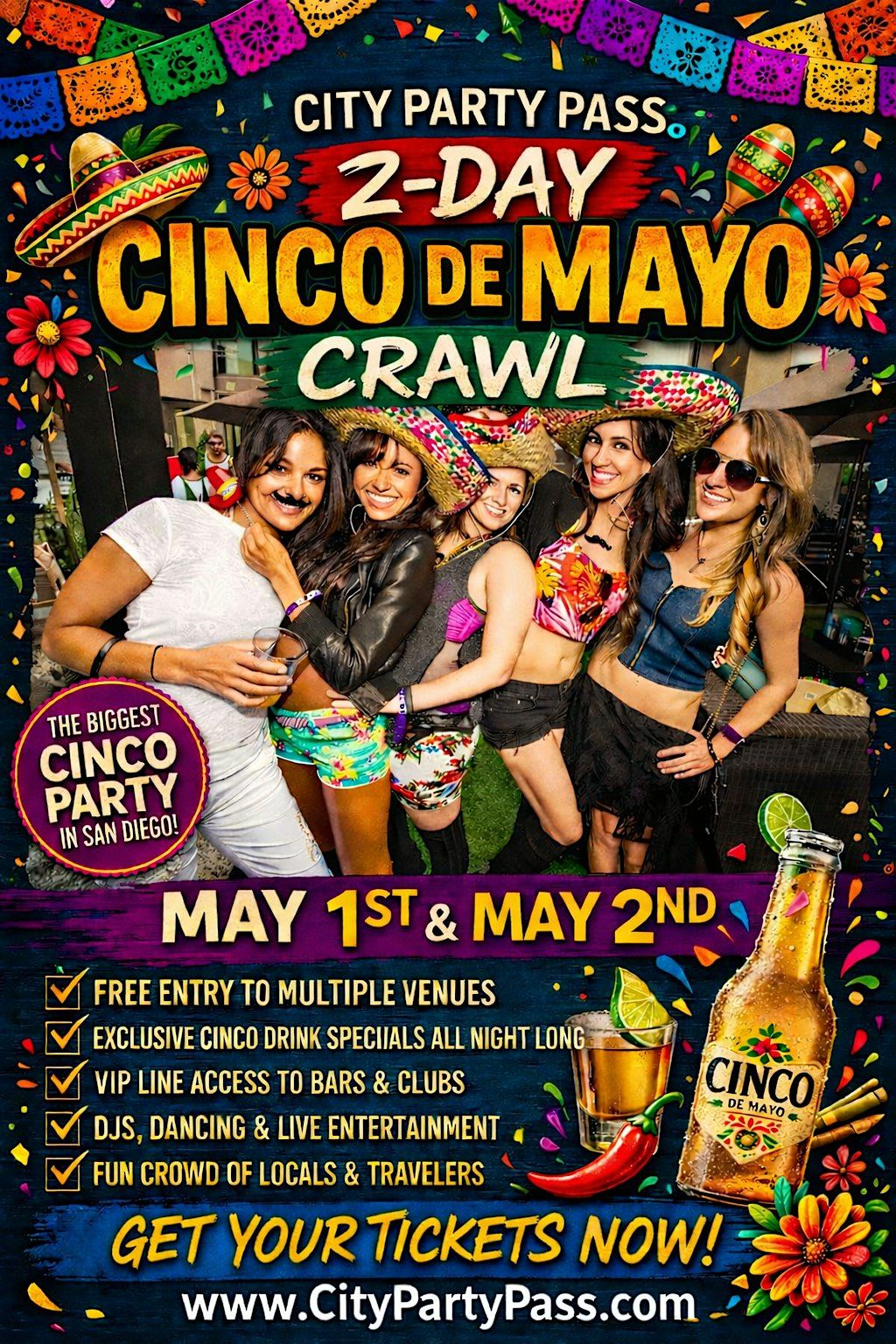 Get ready to party all across Old Town Scottsdale and celebrate Cinco de Mayo with the ultimate bar crawl experience. Enjoy access to multiple participating bars, lounges, and nightlife hotspots โ all featuring margarita specials, tequila shots, and high-energy fiesta vibes all weekend long.