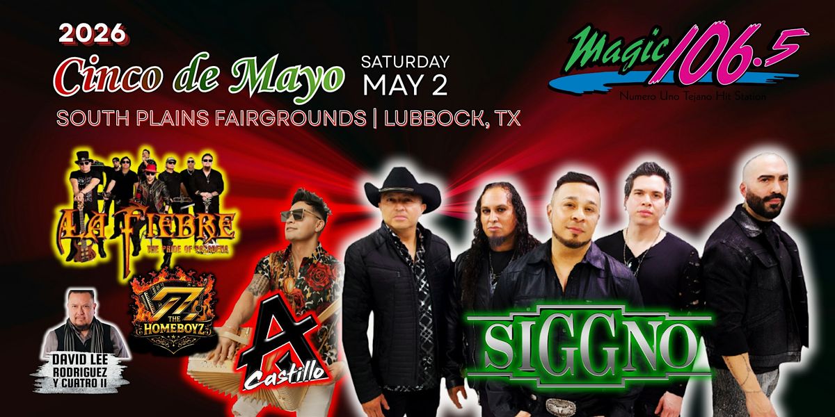 Join us for Magic 106.5 Cinco de Mayo Celebracion Saturday, May 2nd at the South Plains Fairgrounds! Tradicion, Cultura, comida, and nonstop musica all day long! Live on the Ted Liggett Musica Mas Grande stage Siggno, AJ Castillo, La Fiebre, The Homeboyz, David Lee Rodriguez y Cuatro 11! Plus, special performances from Coronado High School’s Mariachi Mesteño and Lubbock High Ballet Folklórico de Oro! The Optimum Gates open at 11AM! Presale tickets $25 and kids 12 and under get in FREE! For Table Reservations in the Viva Land Group VIP Area call 806-745-3434! Come Celebrate with US!