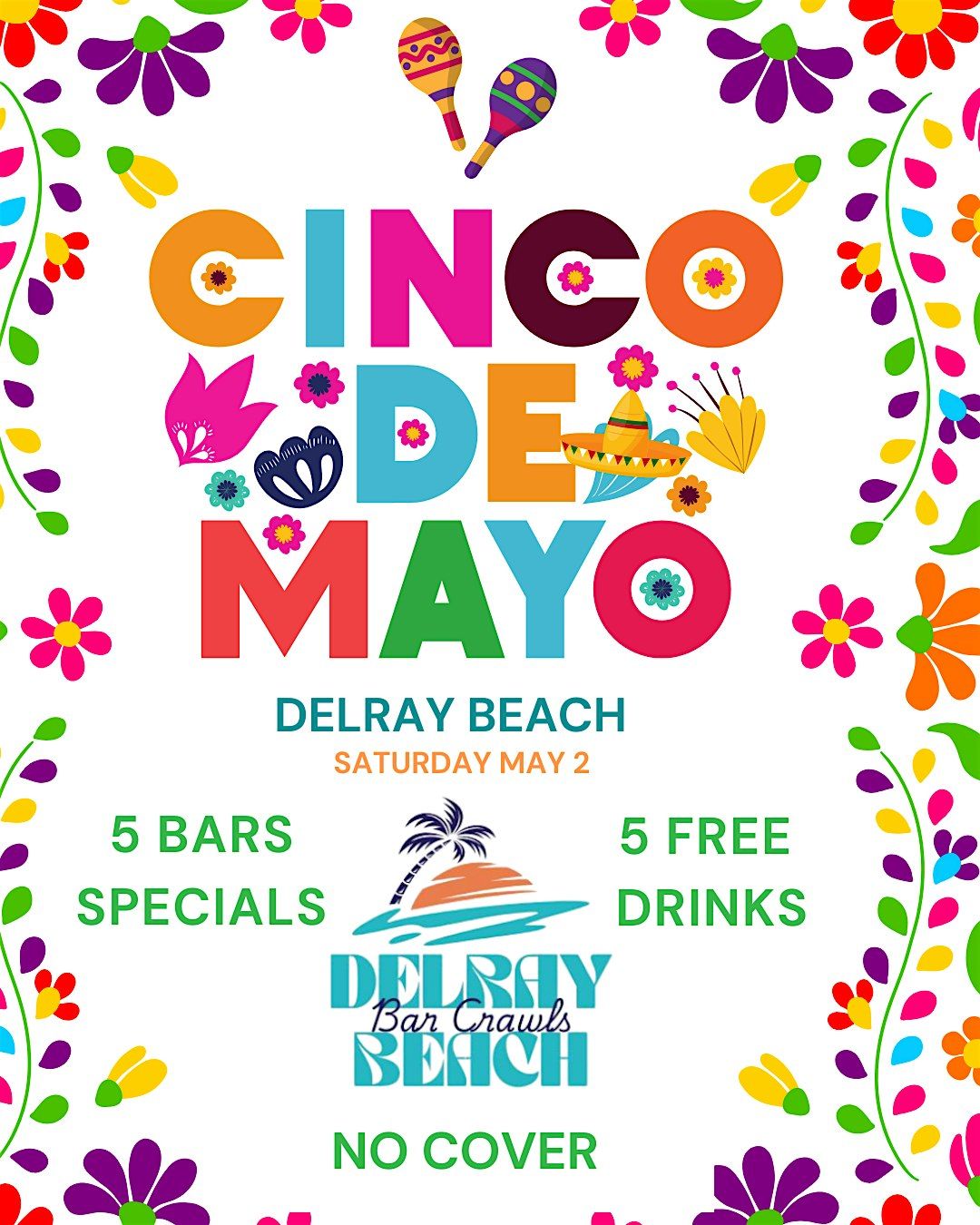 🌶️Crawlees, get ready for an incredible time at the ultimate CINCO DE MAYO BAR CRAWL ! Join us on Saturday, May 2nd, for a day filled with tequila, tacos and mariachi vibes all with your favorite amigos and amigas at the CINCO DE MAYO BAR CRAWL on ATLANTIC AVE! 🪇Whether you're wanting to celebrate Mexican culture and party, or just looking to get spicy, this event is perfect way to celebrate the holiday! 🌮 Don't miss out on the fun and come ready to bar hop the best DELRAY BEACH has to offer!🎉