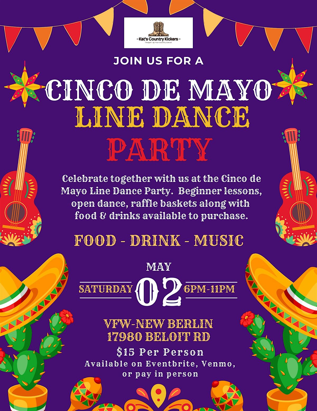 Enjoy food available for purchase before the dance and take your chances on Cinco de Mayo themed raffle baskets. Proceeds from the food 🌮🍋🟩& raffle baskets will be benefiting the VFW. ❤️🩵 So let's dance for a great cause!