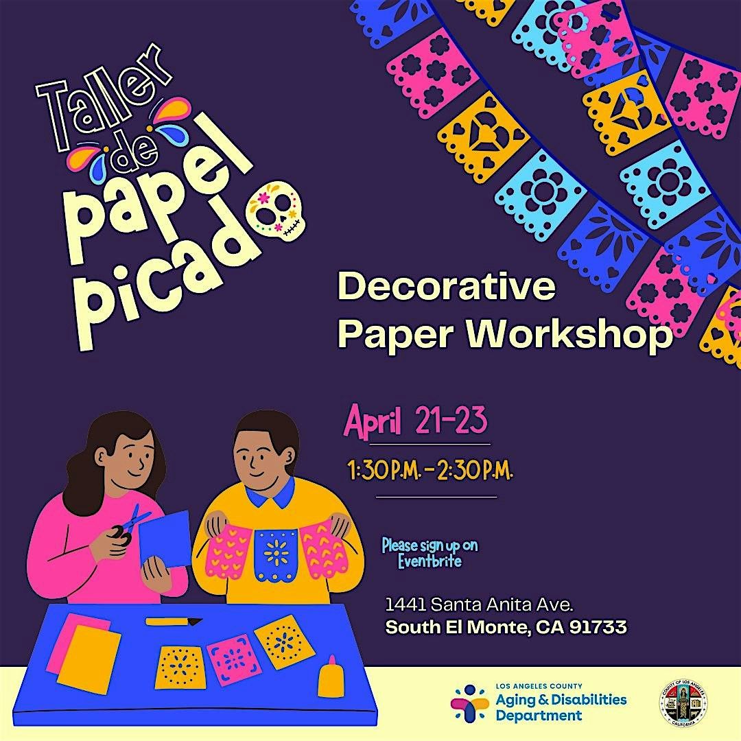 Workshop to make decorations for Cinco De Mayo Celebration. Learn to make hanging paper decorations called, "papel picado." Free! Just sign up on Eventbrite. Three consecutive days to participate. Come to one or come to all. See you soon.