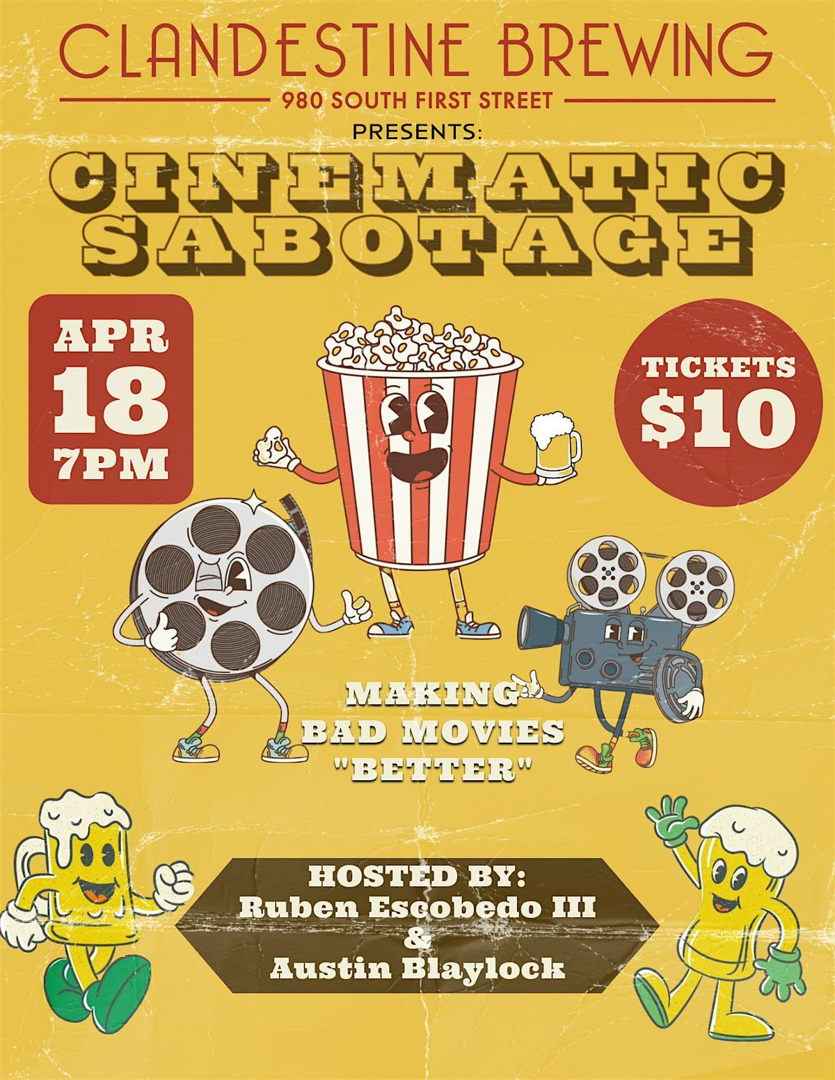 Welcome to Cinematic Sabotage! Get ready for a night of movie mayhem at Clandestine Brewing. Join us on Sat, April 18th at 7:00 PM for a unique cinematic experience like no other. We'll be screening cult classics and hidden gems, with a twist! Each month, comedians Austin and Ruben take the stage to riff, roast, and react to a secret, hilariously awful movie. The twist? The movie’s identity is kept under wraps until the show starts, so expect the unexpected!