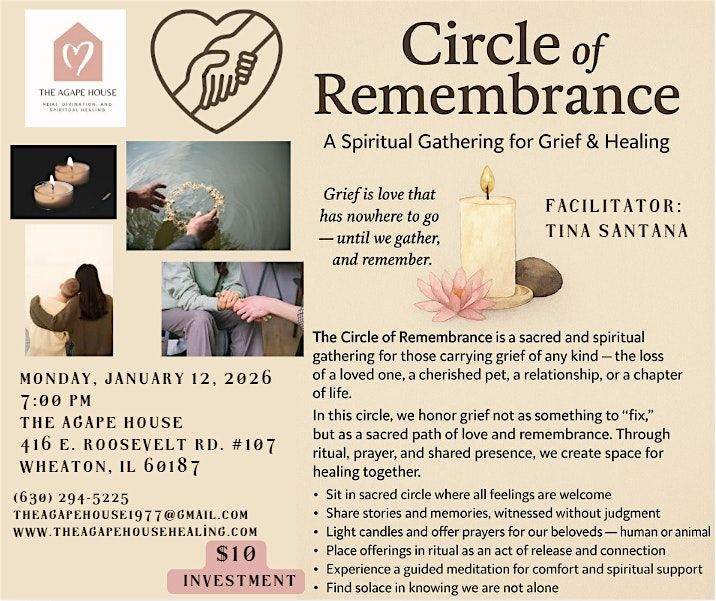 The Circle of Remembrance is a sacred and spiritual gathering for those carrying grief of any kind — the loss of a loved one, a cherished pet, a relationship, or a chapter of life.