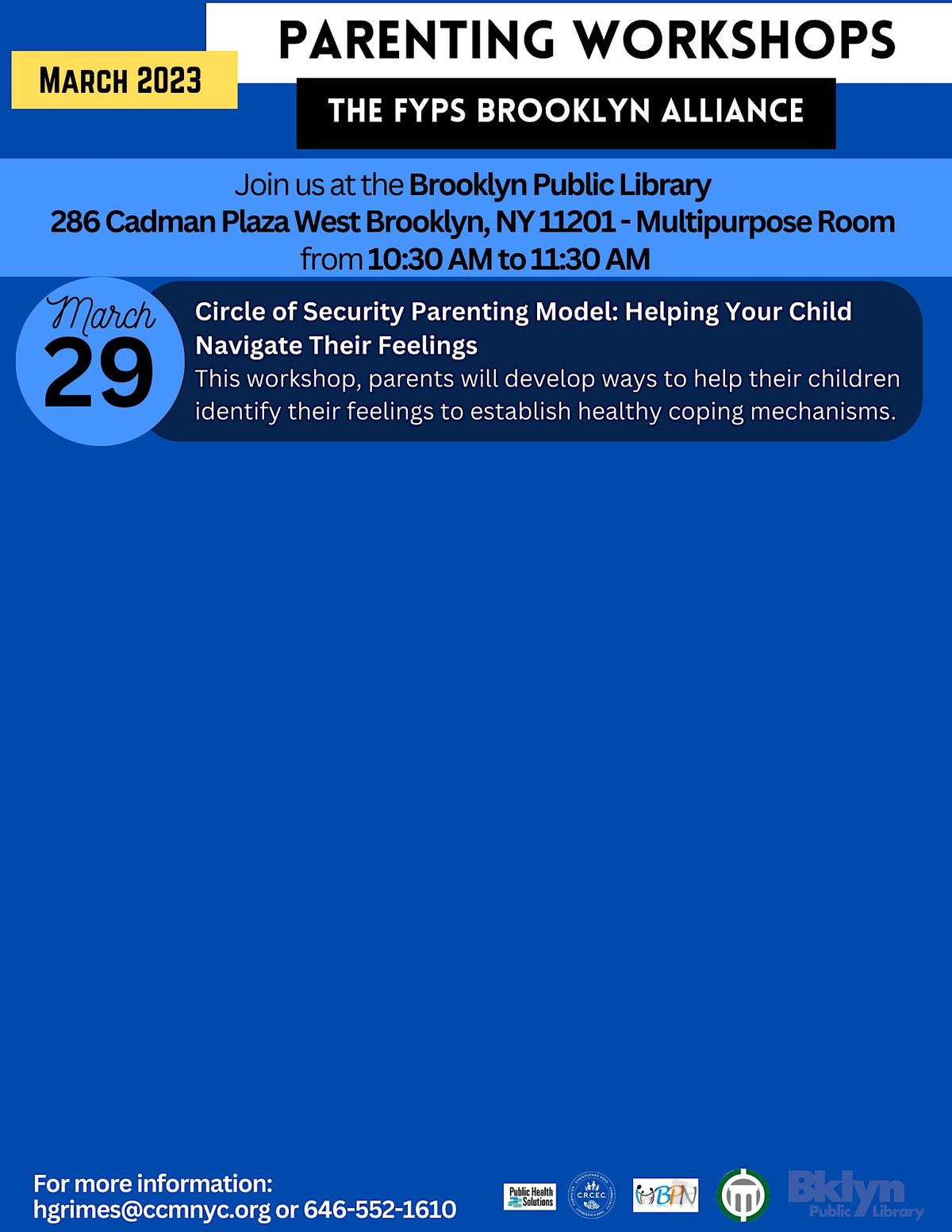 The FYPS Brooklyn Alliance is working in collaboration with the Brooklyn Public Library on a great project providing free parenting workshops. This workshop, parents will develop ways to help their children identify their feelings to establish healthy coping mechanisms. All workshops are facilitated by a Family Peer Advocate who is certified by Circle of Security Parenting Program. Circle of Security Parenting Courses run for 8-weeks. After completion, a certificate will be given and is qualifiable for most court-mandated parenting courses. Please feel free to reach out for more information: [email protected] or 646-552-1610.