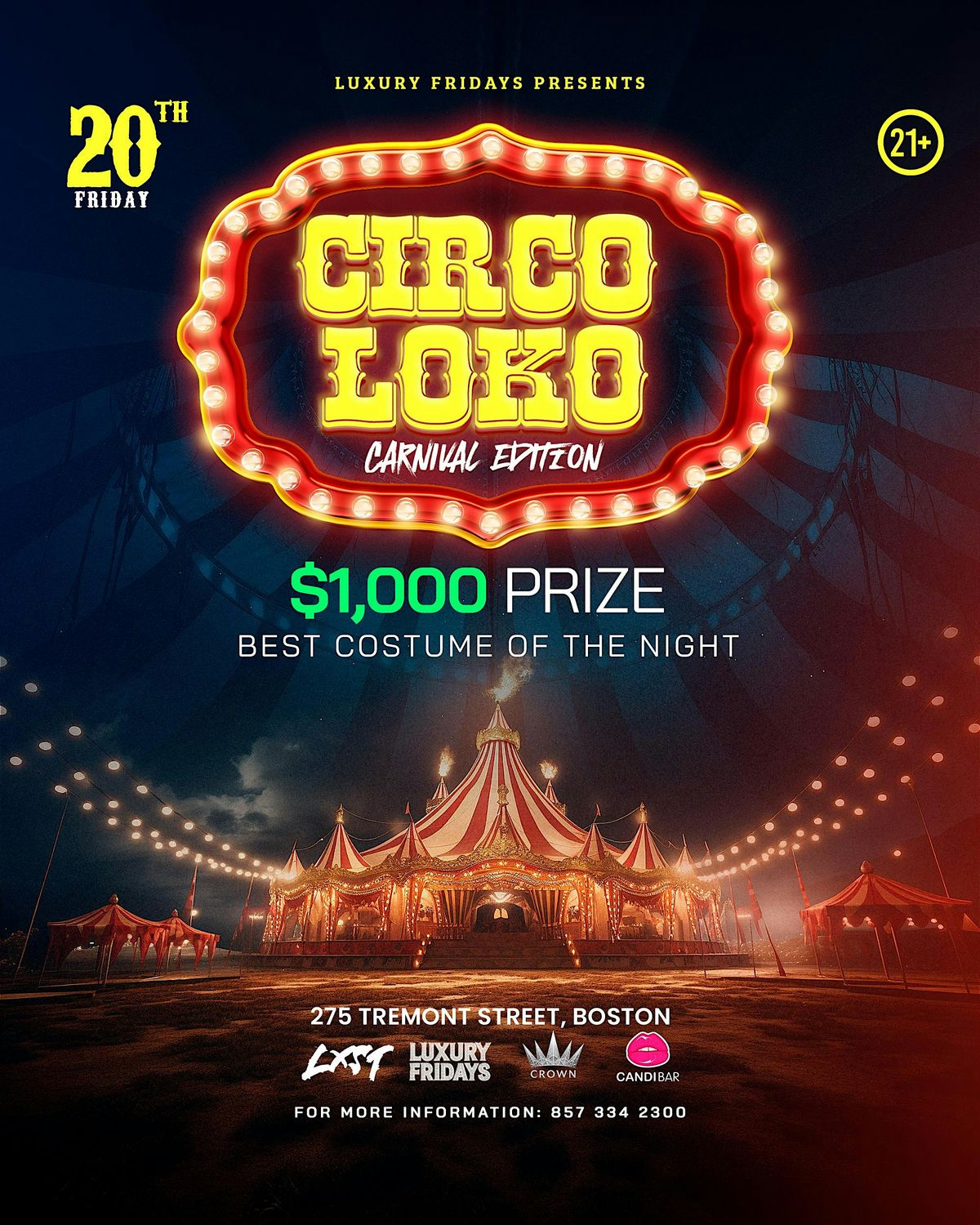 Welcome to CIRCO LOKO at Candibar Boston! Get ready for a night of excitement on February 20, 2026 at 10:00 PM. Join us for a thrilling circus-themed event filled with amazing performances and vibrant energy. Don't miss out on this unforgettable experience! See you there! (Eastern Time)