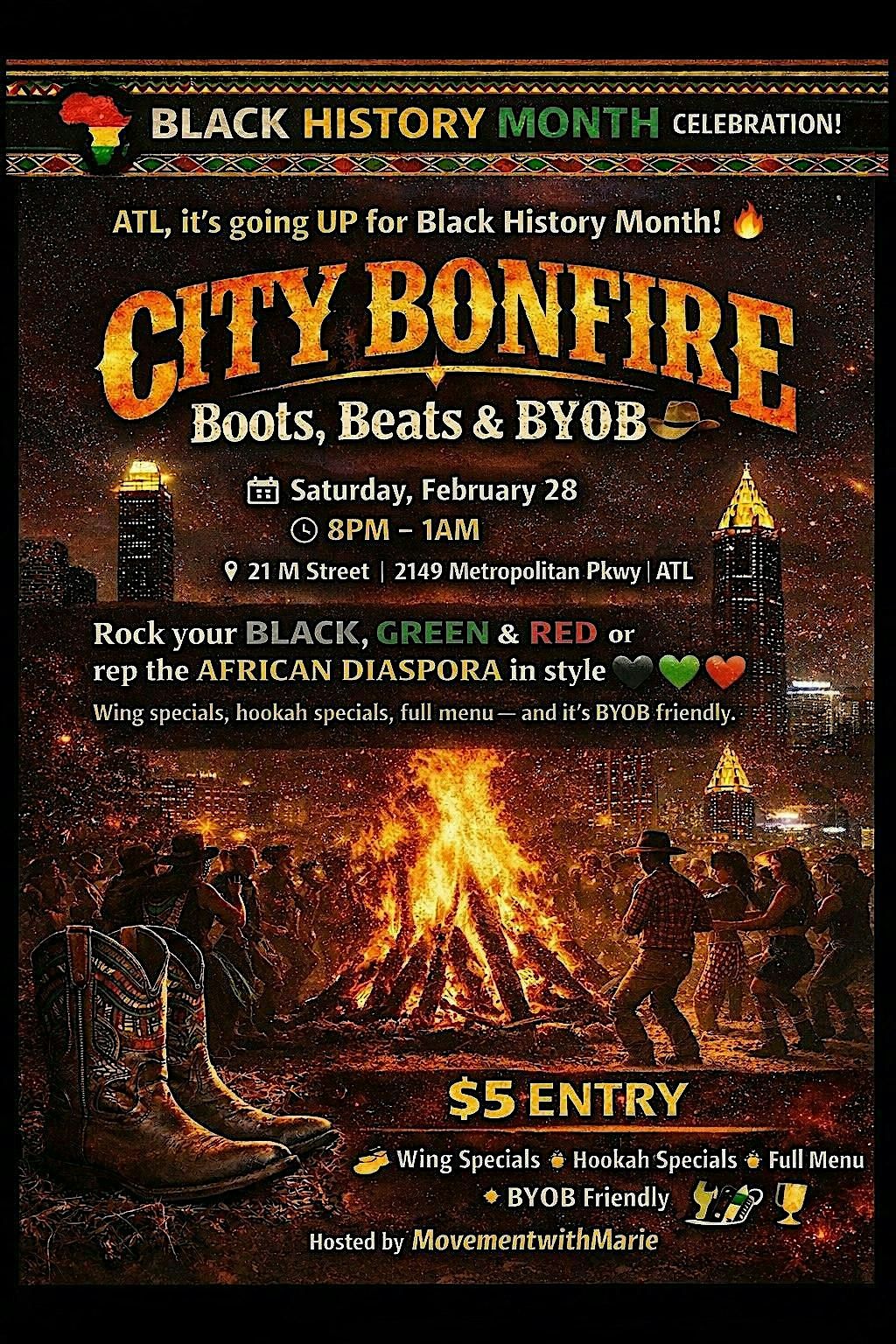 We’re celebrating Black History Month the right way at the CITY BONFIRE: Boots, Beats & BYOB Rock your BLACK, GREEN & RED ❤️About this Event
