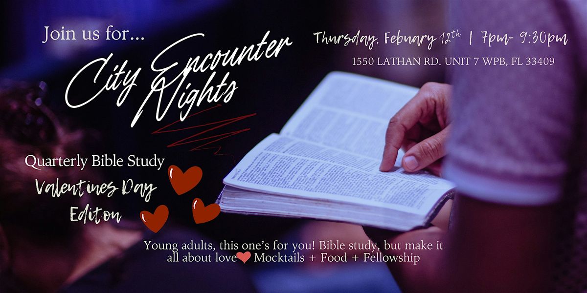 Join us in person for a special Valentine's Day edition of our City Encounter Bible Study! It's the perfect chance to connect, reflect, and dive deep into God's word with friends old and new. Whether you're flying solo or sharing the love, come enjoy meaningful discussions and a warm, welcoming vibe. Don’t miss out on this heartfelt gathering!