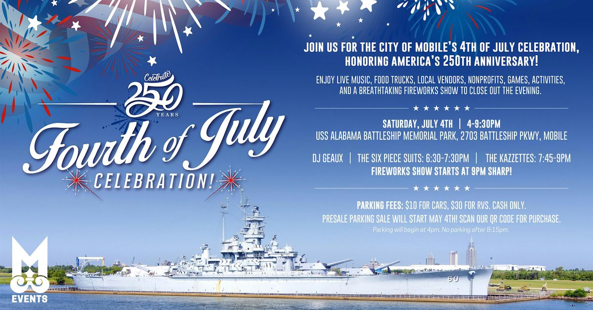 Presale parking is available for the City of Mobile’s 4th of July Celebration to help ensure a smooth arrival on event day. Parking passes are sold per vehicle and must be purchased in advance through Eventbrite.
