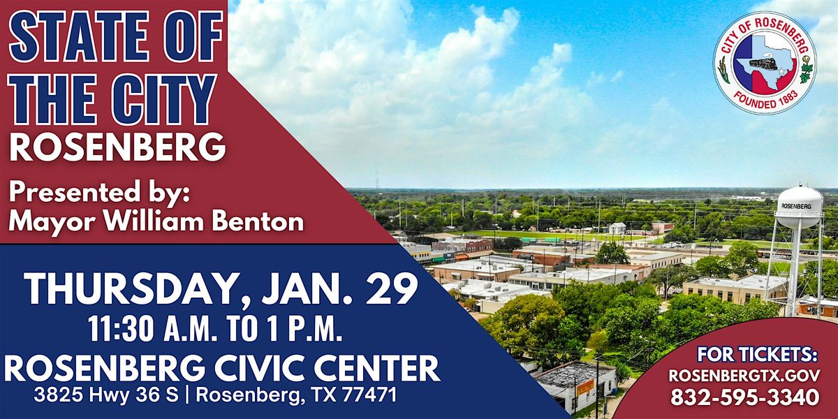 Join us for Mayor William Benton's State of the City address. This event will offer a unique opportunity to hear directly from Mayor Benton regarding the State of the City of Rosenberg, including a look back at the City’s accomplishments over the past year and his vision for Rosenberg's future. The ticketed event will feature a catered lunch.