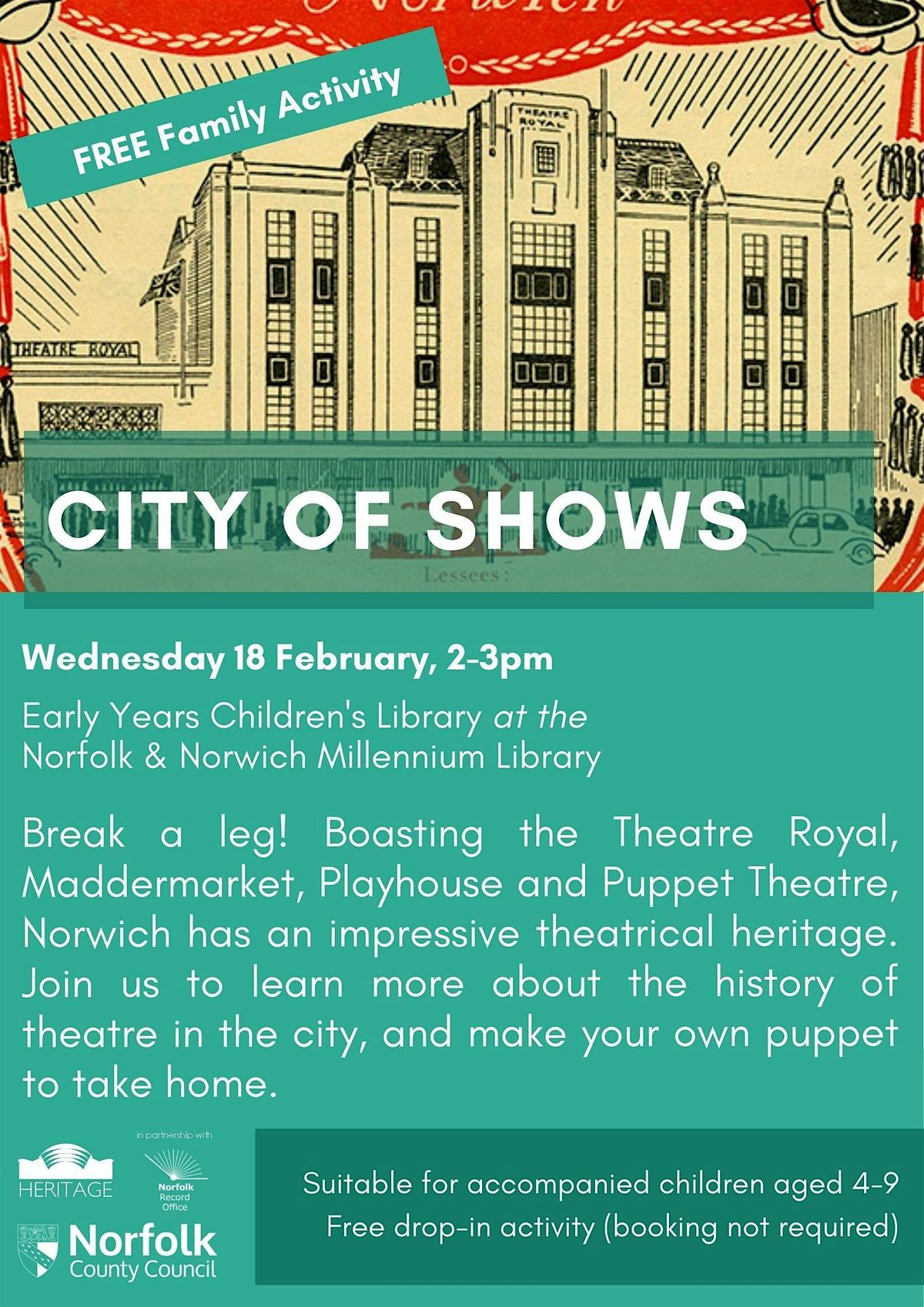 Break a leg! Boasting the Theatre Royal, Maddermarket, Playhouse and Puppet Theatre, Norwich has an impressive theatrical heritage. Join us to learn more about the history of theatre in the city , and make your own puppet to take home.