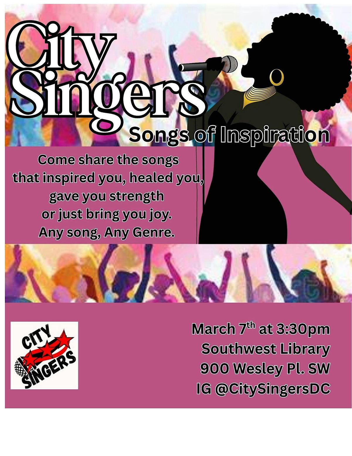Come together, singers of all kings and lovers of song. Join City Singers and share your song of inspiration with others and your story of inspiration, healing, and joy. Any song of any genre. Follow us at www.instagram.com/citysingersdc