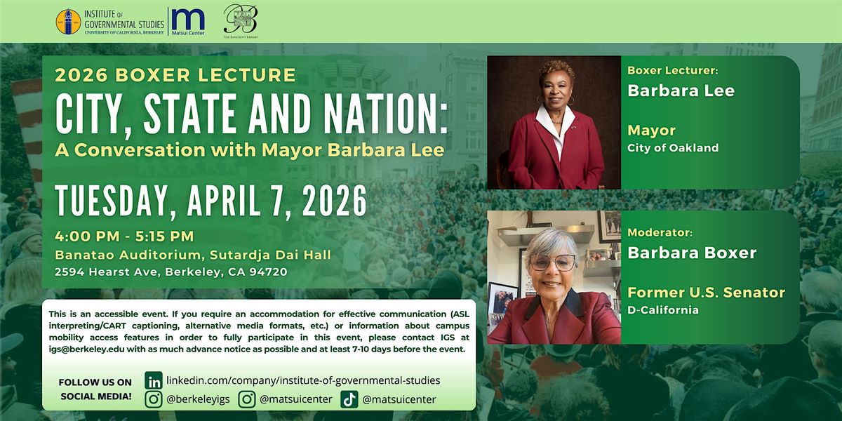 IGS and the Bancroft Library are pleased to announce that Barbara Lee, Mayor of Oakland and Former U.S. Representative for California's 12th District, will be in conversation with former U.S. Senator Barbara Boxer as the 2026 Barbara Boxer Lecturer.