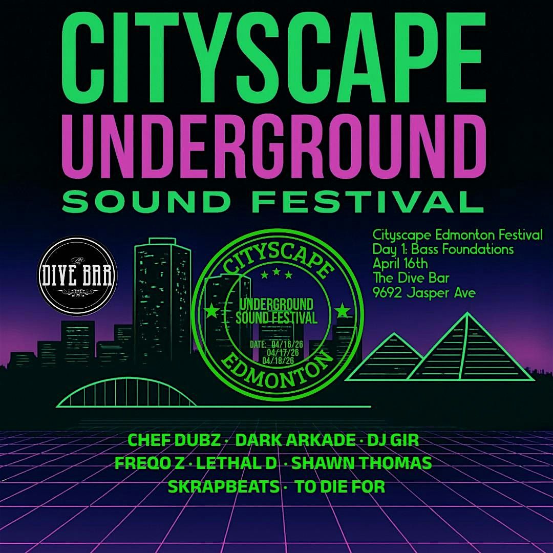 ANNOUNCING THE FIRST‑EVER CITYSCAPE EDMONTON FESTIVAL — APRIL 16–18, 20262026 arrives under the sign of the Horse — a year defined by momentum, unity, and collective stride.There couldn’t be a more fitting moment to introduce something new to Edmonton’s underground community.Cityscape Edmonton Festival is officially here.This is our inaugural year: a three‑night, three‑venue journey built to celebrate the sounds, artists, and dancers who shape the pulse of our city. Cityscape was created to move — across genres, across spaces, and across the communities that make Edmonton’s scene what it is. Each night tells a different story, and together they form the full arc of the festival.DAY 1 — BASS FOUNDATIONS Dive Bar April 16, 2026 Event Page: https://www.facebook.com/share/1AXPKu9Uj5/Cityscape begins where everything starts: the low end.Bass Foundations sets the tone with halftime, dubstep, drum & bass, experimental bass, and the deep frequencies that define Edmonton’s underground identity. This night is for the dancers, the heads, and anyone who feels music in their chest before they hear it.We open the festival by grounding ourselves in the roots of our sound.DAY 2 — GROOVE SECTOR Faculty Event Centre April 17, 2026 Event Page: https://www.facebook.com/share/1BHzFdzqpc/On Night Two, Cityscape shifts into motion.Groove Sector explores the many shades of house — deep, tech, funky, soulful, and high‑energy selections designed to keep bodies moving and spirits lifted. This chapter is about rhythm, colour, and connection.It’s the heartbeat of the festival, carrying us forward with warmth and momentum.DAY 3 — THE CONVERGENCE Zillionaires Lounge April 18, 2026 Event Page: https://www.facebook.com/share/178j7vQznp/The final chapter brings everything together.The Convergence is an all‑genre closing night where bass, house, breaks, techno, and experimental sounds collide in one shared space. This is where artists cross paths, crews blend energy, and the entire community gathers for the last dance of the festival.Cityscape’s identity fully reveals itself here — a celebration of unity, creativity, and the underground in motion.THE 2026 LINEUPACE VAUGHN · CHEF DUBZ · CUTTERSTUNT · DARK ARKADE · DJ GIR · DJ OUIJAH · ENRG · FVX FVCKLEY · FREQO Z · HALF HUG · HOMI · HUNKE · IMPRZM · JASPER BEANS · LETHAL D · MIKEY HAVOK · OH FUNK · RAVEN SAPHIR · REZIDNT FUNK · SHAWN THOMAS · SICKGAZELLE · SKRAPBEATS · STELLY STELLARSON · TO DIE FOR A cross‑section of Edmonton’s finest — from bass architects to groove specialists to genre‑bending innovators.This lineup represents the city we love and the future we’re building together.THE JOURNEY BEGINS NOW. The first Cityscape Edmonton Festival is more than an event — it’s a statement.A commitment to our scene.A celebration of our artists.A moment for our community to move together in stride.In the Year of the Horse, we ride forward with purpose, rhythm, and unstoppable momentum.Three nights. Three venues. One city in motion.Join us for the first chapter of Cityscape.