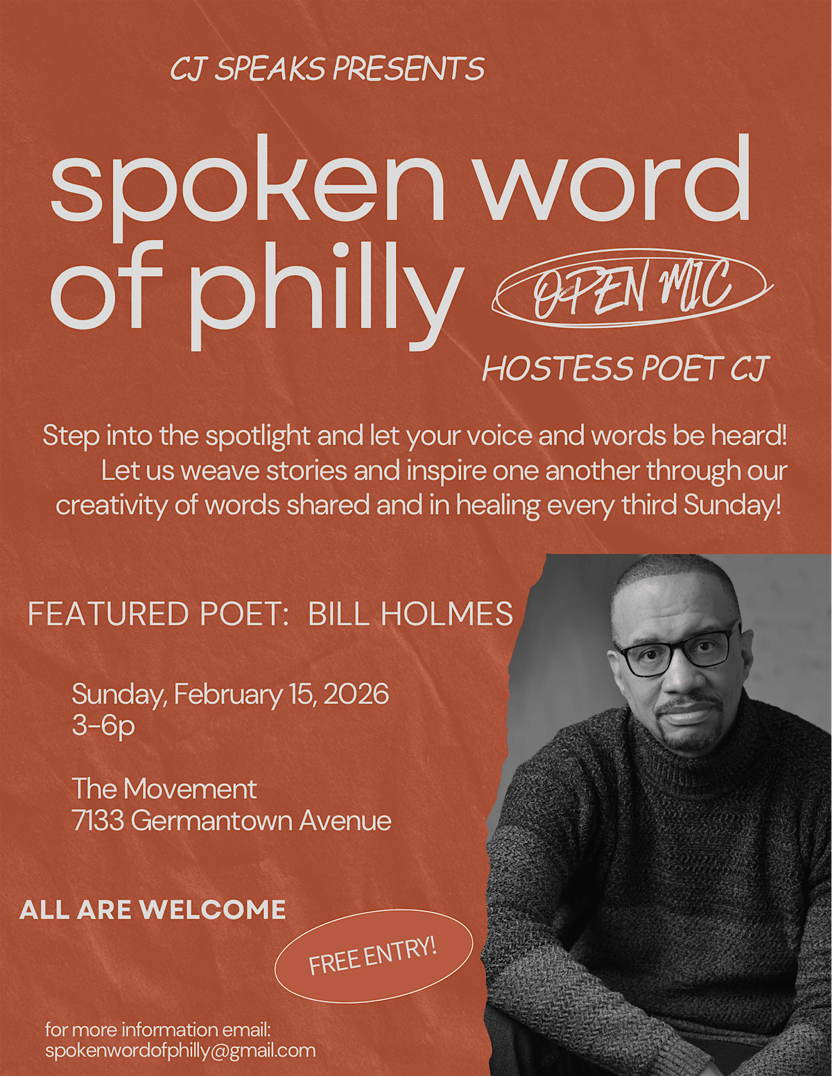 Join poet cj with FeAtUrEd PoEt: Bill Holmes for raw emotions and powerful words at Spoken Word of Philly let your voice be heard! open mic