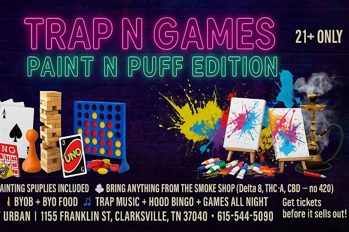 Join us for a night of Music, Games, Art, Food & More! Trap N Games: Paint N Puff Edition — the livest adult game night in Clarksville with a creative twist. Pull up and vibe out with great people, dope trap sounds, and nonstop fun.