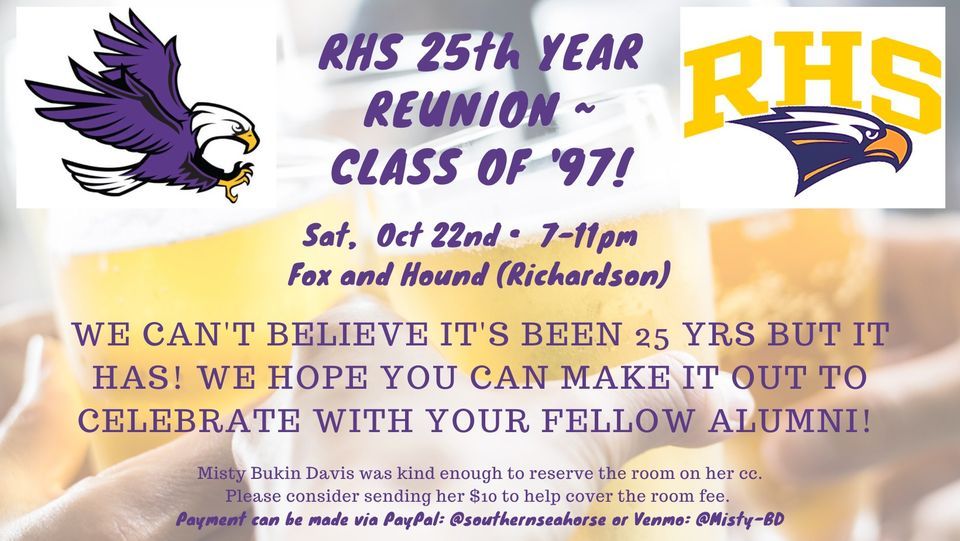 We can't believe it's been 25 yrs but it has! we hope you can make it out to celebrate with your fellow alumni!Misty Bukin Davis was kind enough to reserve the room on her cc. Please consider sending her $10 to help cover the room fee.