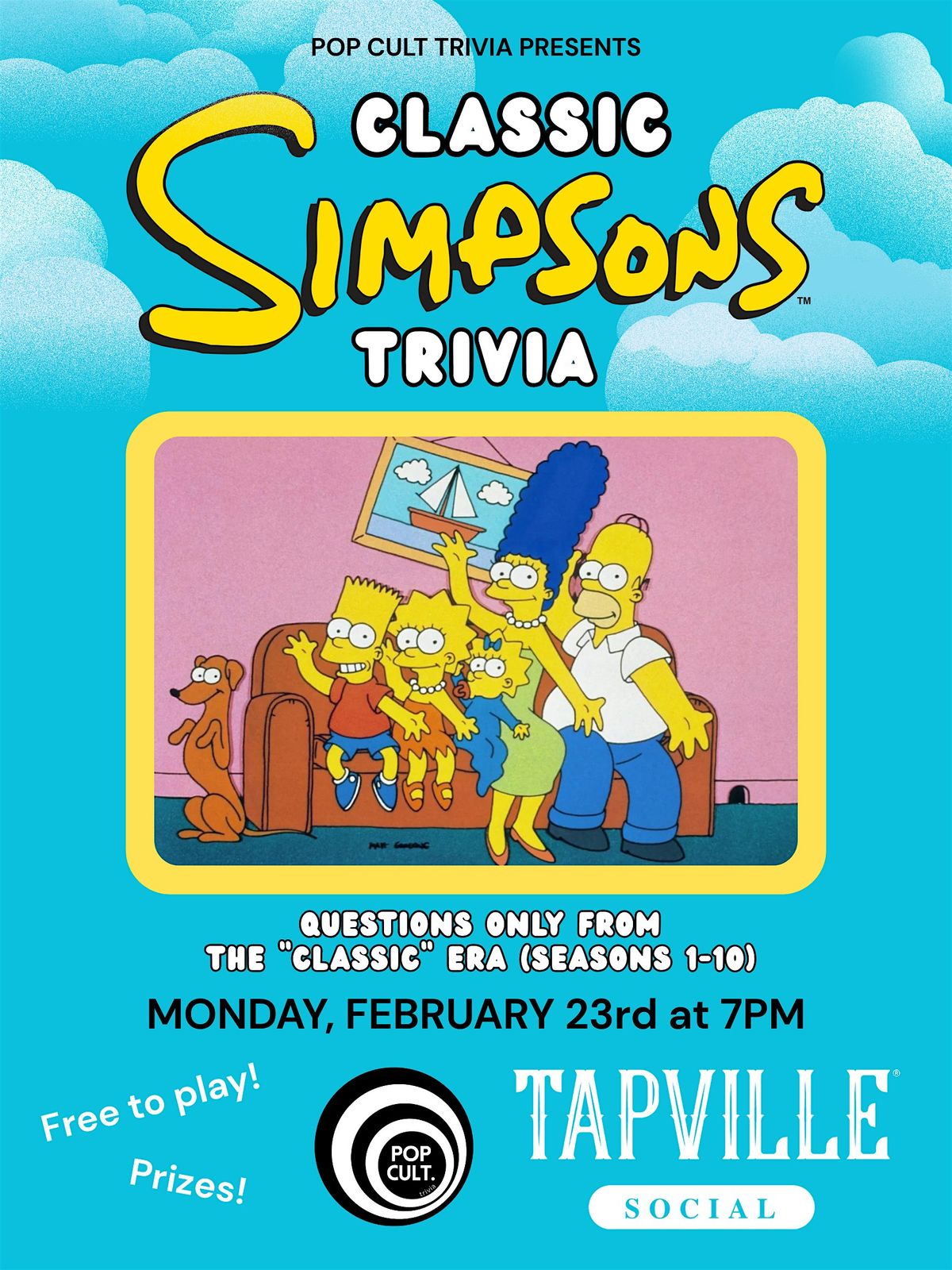 7pm on Monday the 23rd at Tapville Social in Newport Centre Mall! Questions only from the golden age of the show! (seasons 1-10) Free to play and prizes for the top couple teams! Classic Simpsons videos! Delicious food! Booze! Good times!