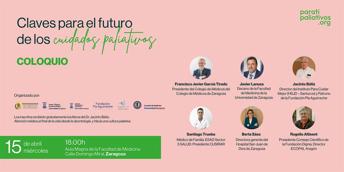 COLOQUIO: Francisco Javier García Tirado, Presidente del Colegio de Médicos del Colegio de Médicos de Zaragoza; Javier Lanuza, Decano de la Facultad de Medicina; Jacinto Bátiz, Director del Instituto Para Cuidar Mejor del Hospital de San Juan de Dios de Santurce (Vizcaya) y Patrono de la Fundación Pía Aguirreche; Santiago Trueba, Médico de Familia de ESAD Sector 3 SALUD y Presidente CUSIRAR; Berta Saez, Directora gerente del Hospital San Juan de Dios de Zaragoza; Rogelio Altisent, Presidente Consejo Científico de la Fundación Dignia. Director ECOPAL Aragón.