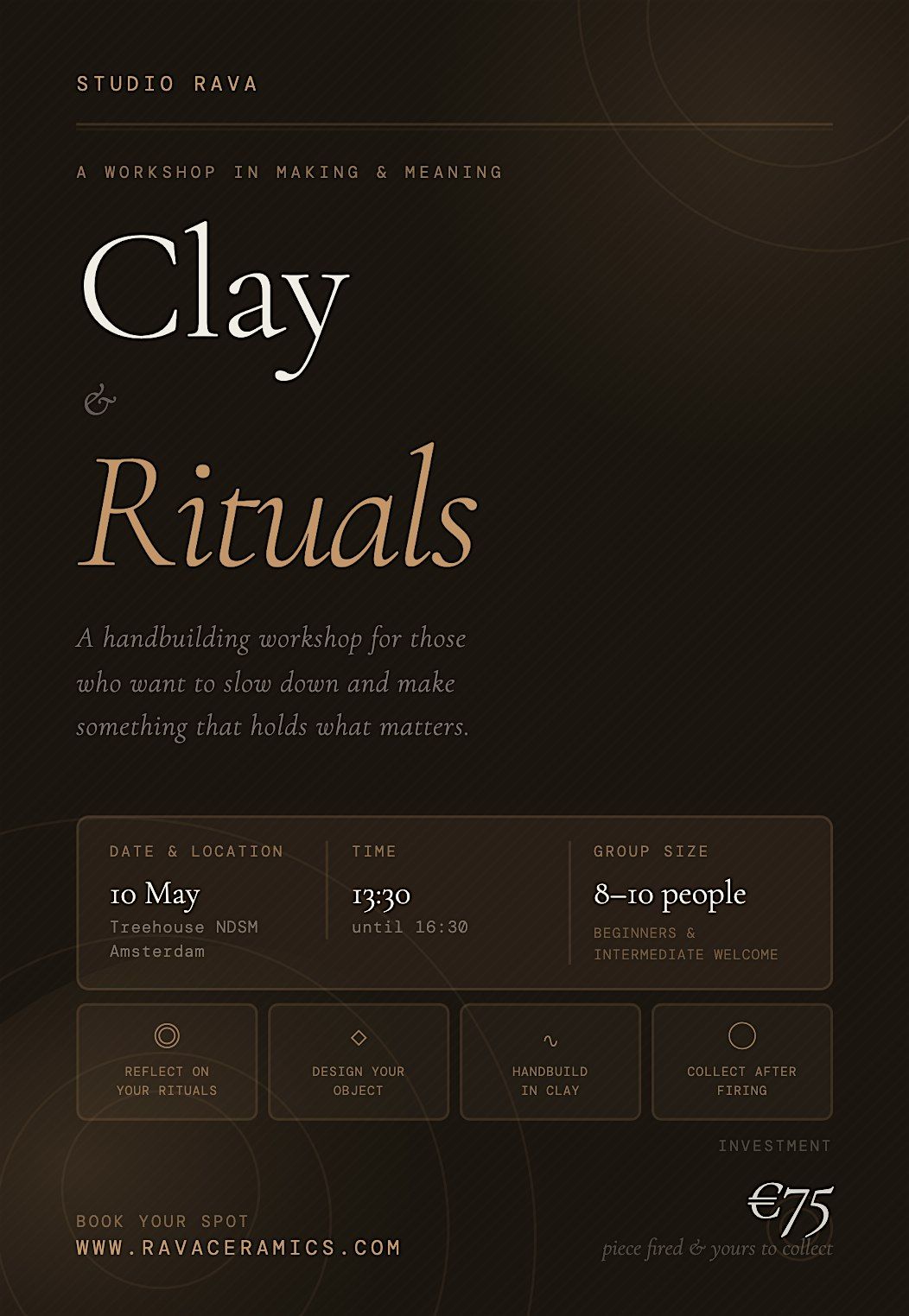 - Ritual in Conversation: Why ritual matters and what it signals to our nervous system. Talking about the rituals of creative people, and why to choose clay. With guided questions, personal and group exercise to reflect on your own day, habits and rituals.