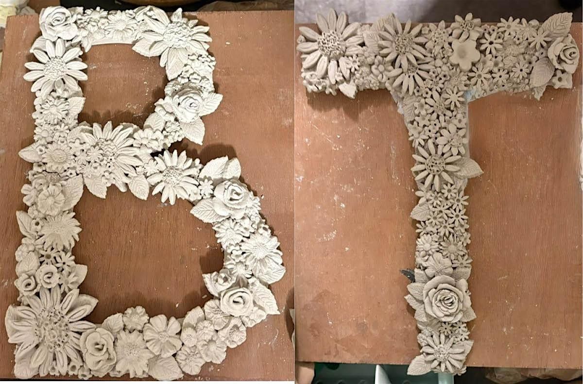 Using white clay and our templates you will firstly cut a letter or heart shape. Then you will decorate with a combination of flowers made in moulds and hand sculpted.