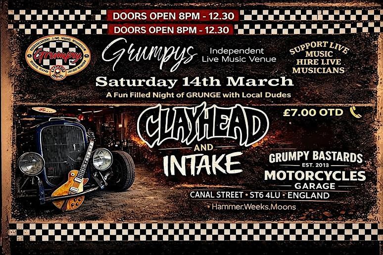 Get ready for a night of live tunes with Clayhead and Intake hitting the stage at the legendary Grumpy’s in good old GB!