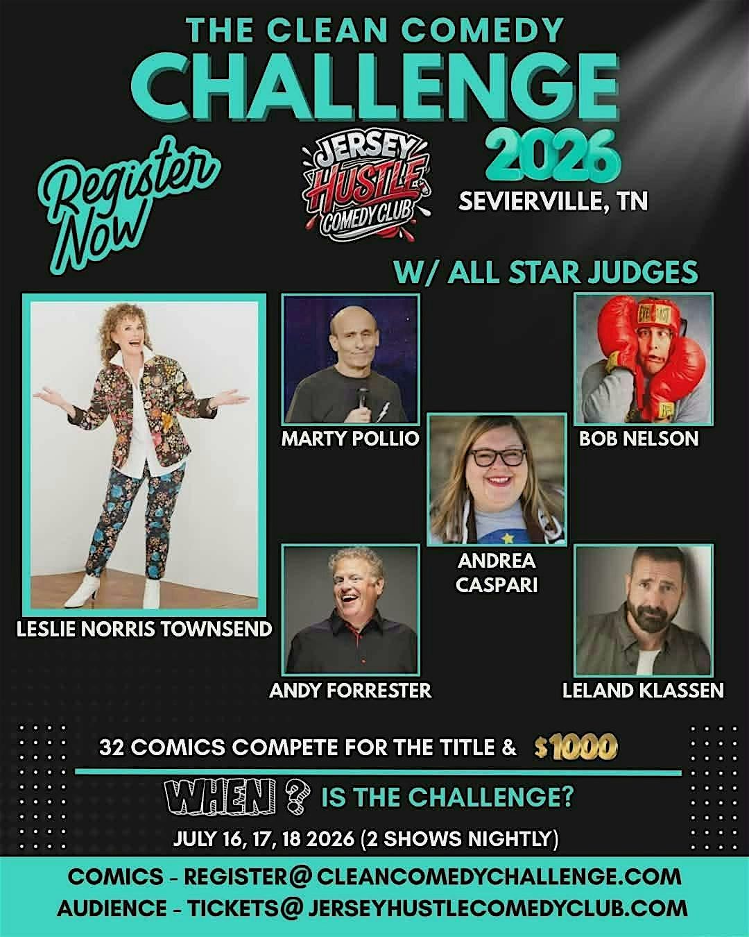 Get ready for three nights of big laughs, clean comedy, and fierce competition at the Clean Comedy Challenge 2026, hosted at Jersey Hustle Comedy Club in Sevierville, Tennessee.