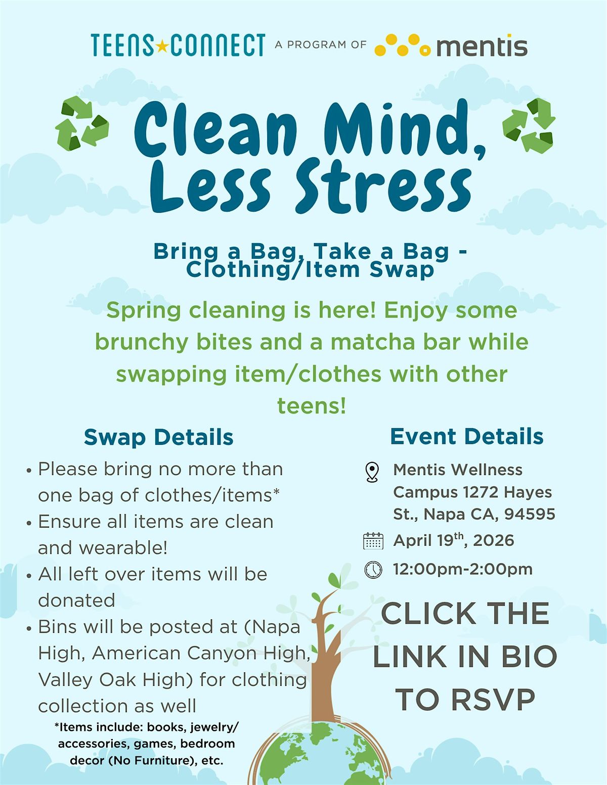 Ready to chill out and clear your head? Come hang out at Mentis Wellness Campus on April 19, 2026 at 12:00 PM (Pacific Time). We will be hosting a clothing/item swap along with brunchy bites and a matcha bar for teens in Napa County ages 13-19! Please ensure any items you bring a clean, wearable, and appropriate.