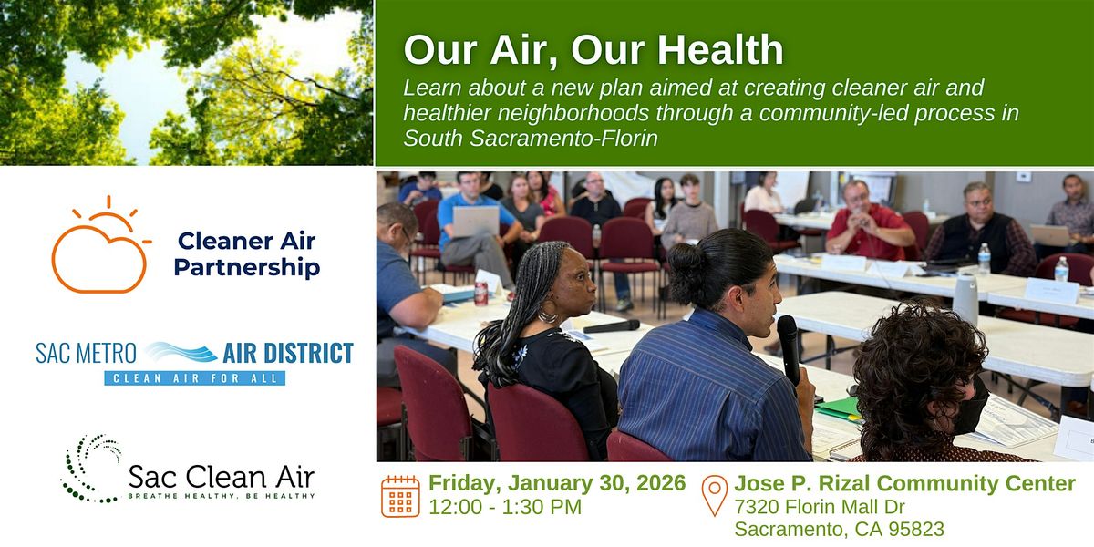 Join the Cleaner Air Partnership (CAP) in-person on Friday, January 30th, 2026 at the Jose P. Rizal Community Center from 12:00 - 1:30 PM to learn from the Sac Metro Air District about the Community Air Protection Program’s South Sacramento-Florin Community and work to improve air quality and protect public health through a community-led process. Attendees will learn about a new Community Emissions Reduction Plan (CERP), strategies in the plan, and how businesses and stakeholders can partner on future projects.