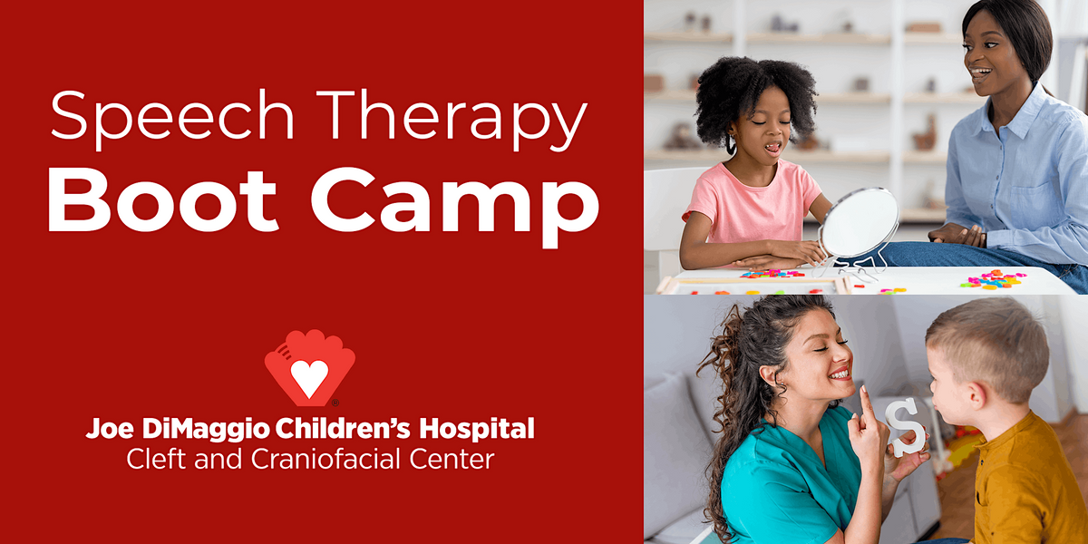 Speech Therapy Boot Camp Day is a fun and educational one-day event hosted by the Cleft and Craniofacial Center at Joe DiMaggio Children's Hospital. It's designed to focus on improving speech intelligibility and communication skills by targeting accurate oral placement for sound production and eliminating compensatory speech errors. Participants will also be able to interact with other families in a relaxing environment and develop friendships.