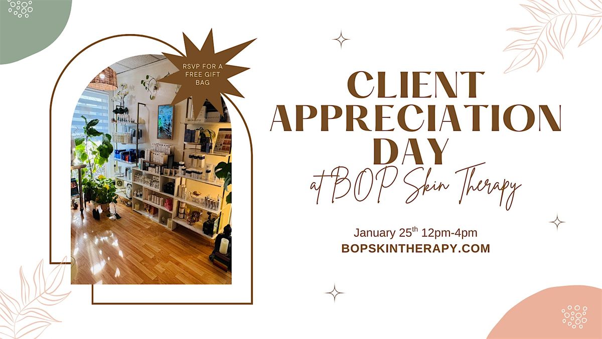 Join BOP Skin for Client Appreciation Day on January 25th from 12 PM to 4 PM! Enjoy complimentary skin analysis, sweet treats, and exclusive product and package promotions available only during this special event.