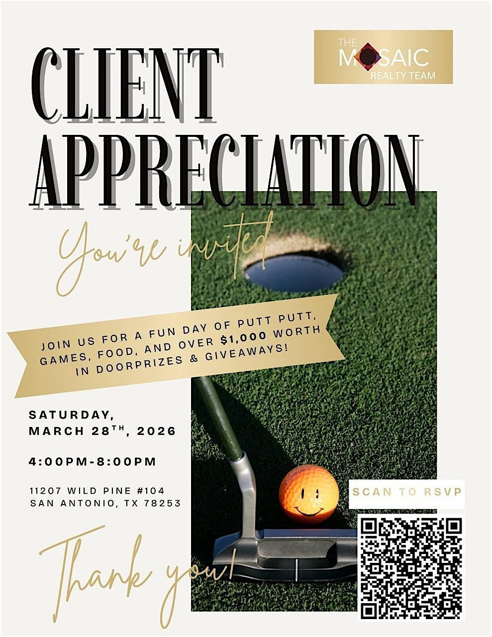 Join us for a fun evening of putt-putt, games, food, and great company as we celebrate our amazing clients, friends, and community. We’ll also have over $1,000 in door prizes and giveaways throughout the night.