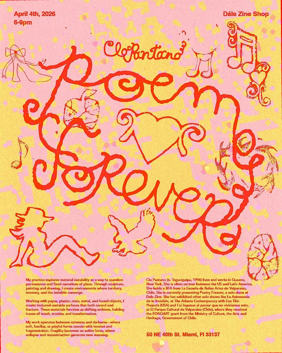 Clo Pantano (b. Tegucigalpa, 1996) lives and works in Queens, New York. She is often on tour between the US and Latin America. She holds a BFA from La Escuela de Bellas Artes de Valparaíso, Chile. She is currently presenting Poetry Forever, a solo show at Dale Zine. She has exhibited other solo shows like La Autonomia de lo Invisible, at The Atlanta Contemporary with Eso Tilin Projects (USA) and Fui Ingenux al pensar que no viviriamos esto, at El Parque Cultural de Valparaiso (Chile), where they received the FONDART grant from the Ministry of Culture, the Arts and Heritage, Government of Chile.