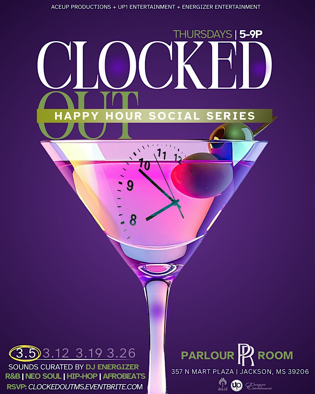 CLOCKED OUT is a sophisticated after-work happy hour experience created for working professionals seeking a refined way to relax, connect, and recharge. Taking place every Thursday at 5PM, this weekly gathering blends smooth cocktails, curated music, and a stylish atmosphere designed for effortless unwinding after the workday.