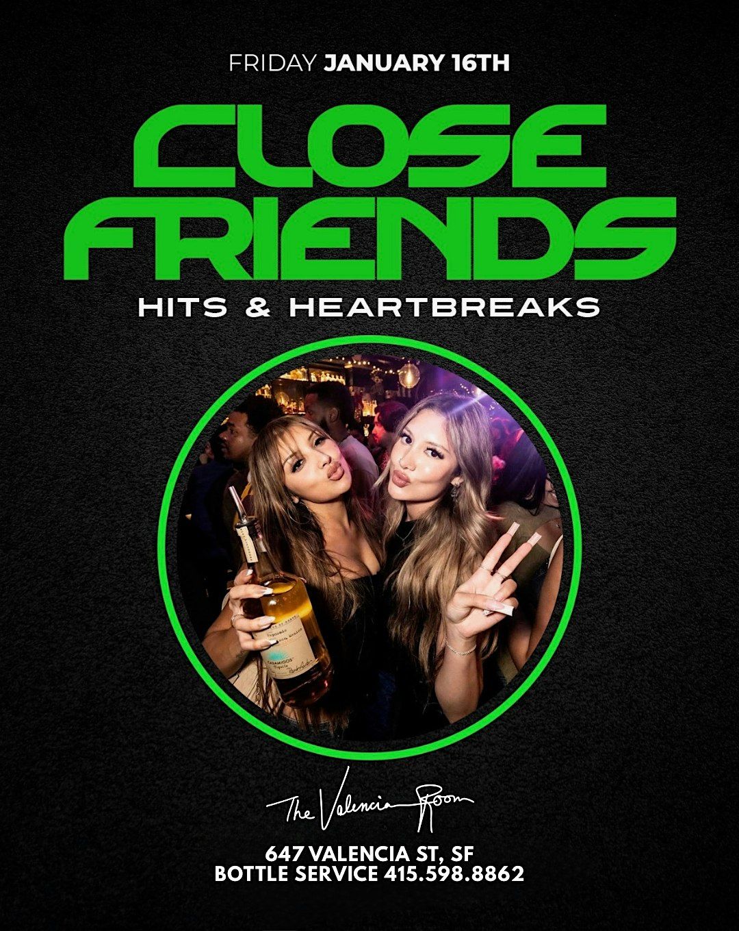Close Friends — Hits & Heartbreaks. The real ones inside, everyone else watching. Bottles popping, sweat dripping, and Bad decisions encouraged.