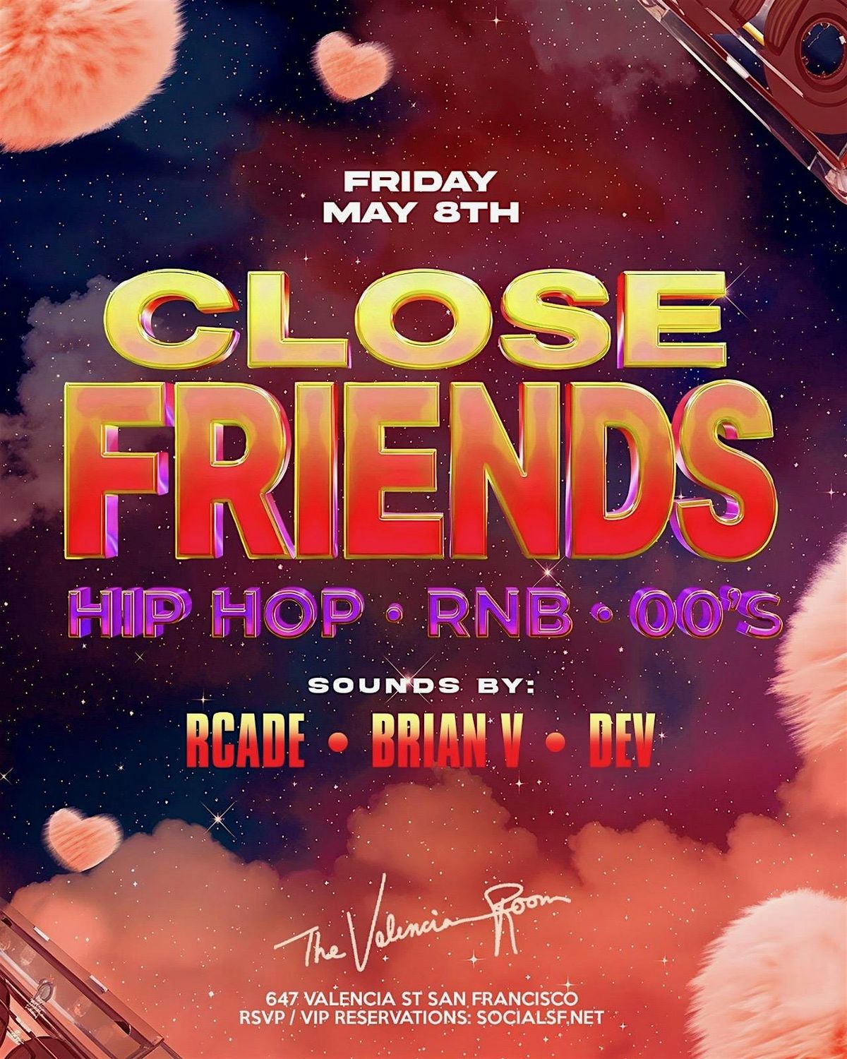 Close Friends - Hip Hop - RNB - 00's. The real ones inside, everyone else watching. Bottles popping, sweat dripping, and Bad decisions encouraged.