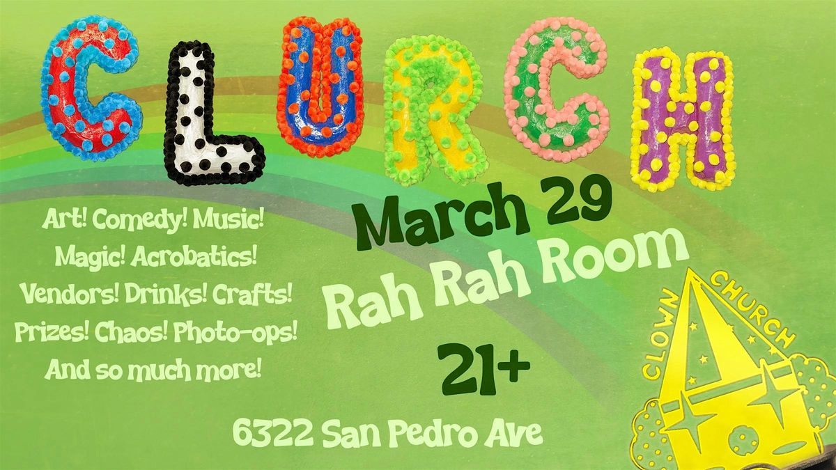 Welcome to the Clown Church Variety Show at Rah! Rah! Room! Get ready to laugh, be amazed, and enjoy a night of fun performances. Join us on March 29th, 2026 at 7:00 PM for a memorable evening. Don't miss out on this unique event that will leave you down to clown!