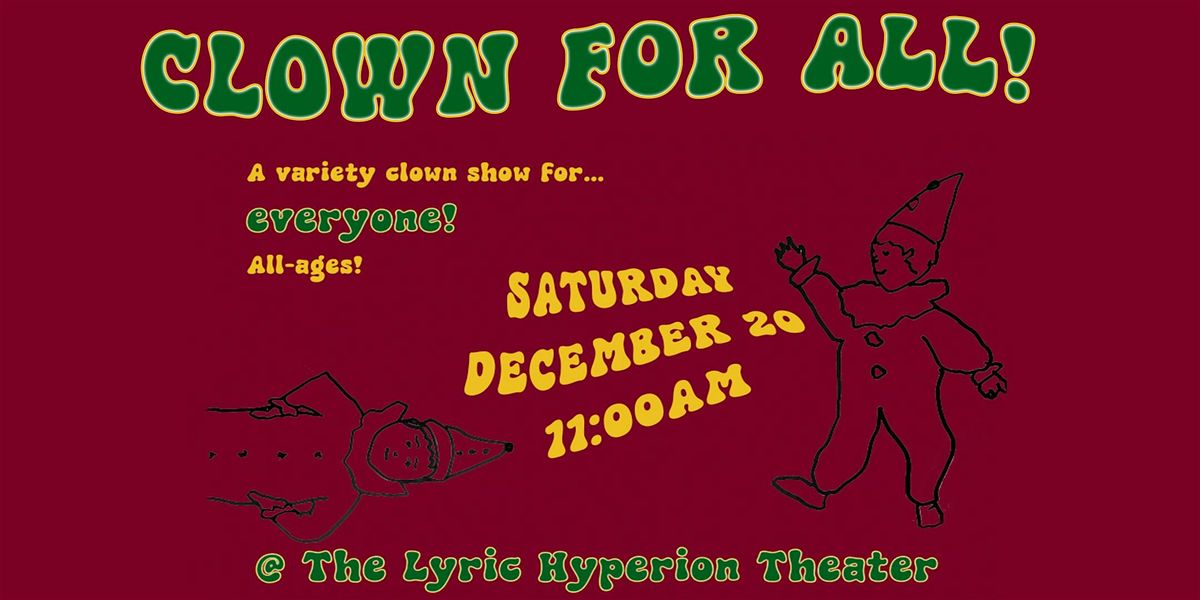 Come one, come all, to a morning with the best part of the circus -- the clowns! This hour-long show will feature a variety of acts from up-and-coming clowns in LA's burgeoning "plain clothes clown" community. Think less red noses and big shoes, and more silly playfulness and audience interaction. Hosted by parent, educator, and "the warmest comedic performer in Los Angeles," RM Aranda, "Clown for All" is a regular show at the Lyric Hyperion that aims to create comedy that makes everyone laugh, from ages 0-99. Grab a coffee and a pastry at the Lyric cafe, and join us for a cozy morning of comedy that will give you positive vibes for the rest of the week.