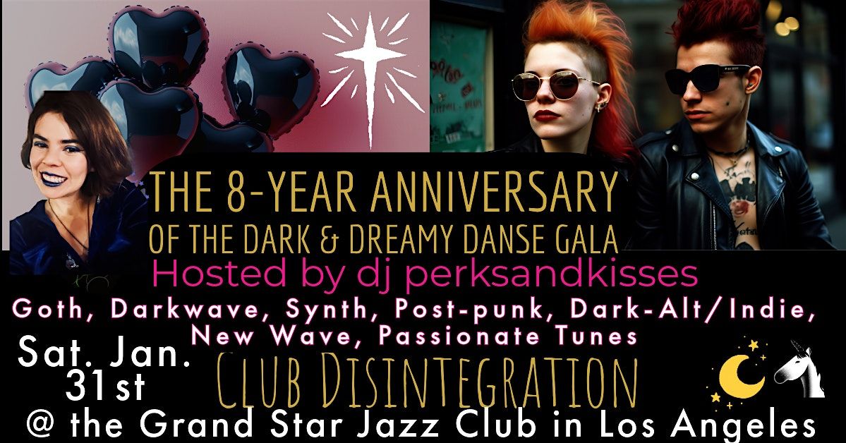On Saturday, JAN. 31st, DJ perksandkisses hosts Club Disintegration, the dark and dreamy danse gala @ the Grand Star Jazz Club in Chinatown, Los Ángeles. Downstairs. We will be celebrating our 8-Year Anniversary Party--open to all! Thank you so much for the overwhelming support over the years!
