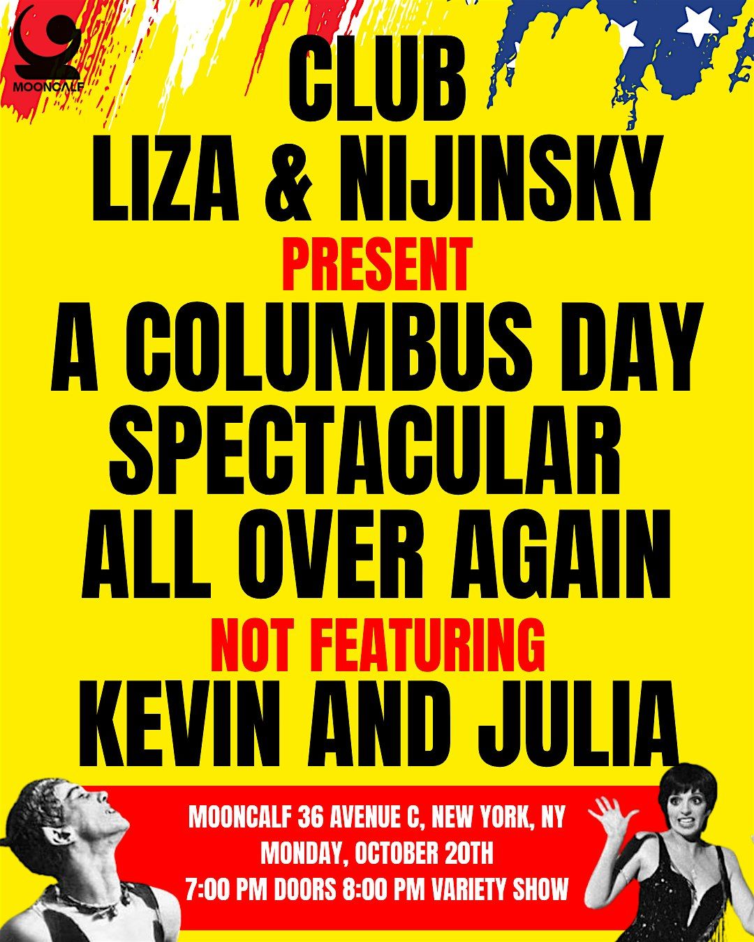 Come help Liza & Nijinsky party at their Columbus Day Spectacular! Julia Eichten & Kevin Zambrano are curating this whimsical event with dance, music, and lots of jokes.