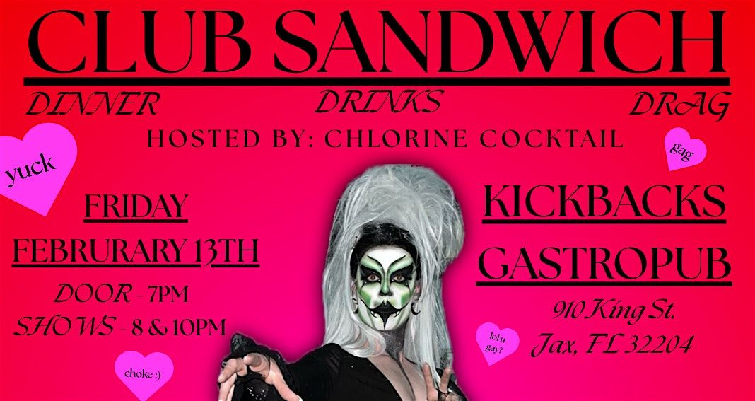 Celebrate (or reject) the holiday of love and romance with Chlorine Cocktail and her fabulous Drag Queen cast at Kickbacks Gastropub! February, Friday the 13th!