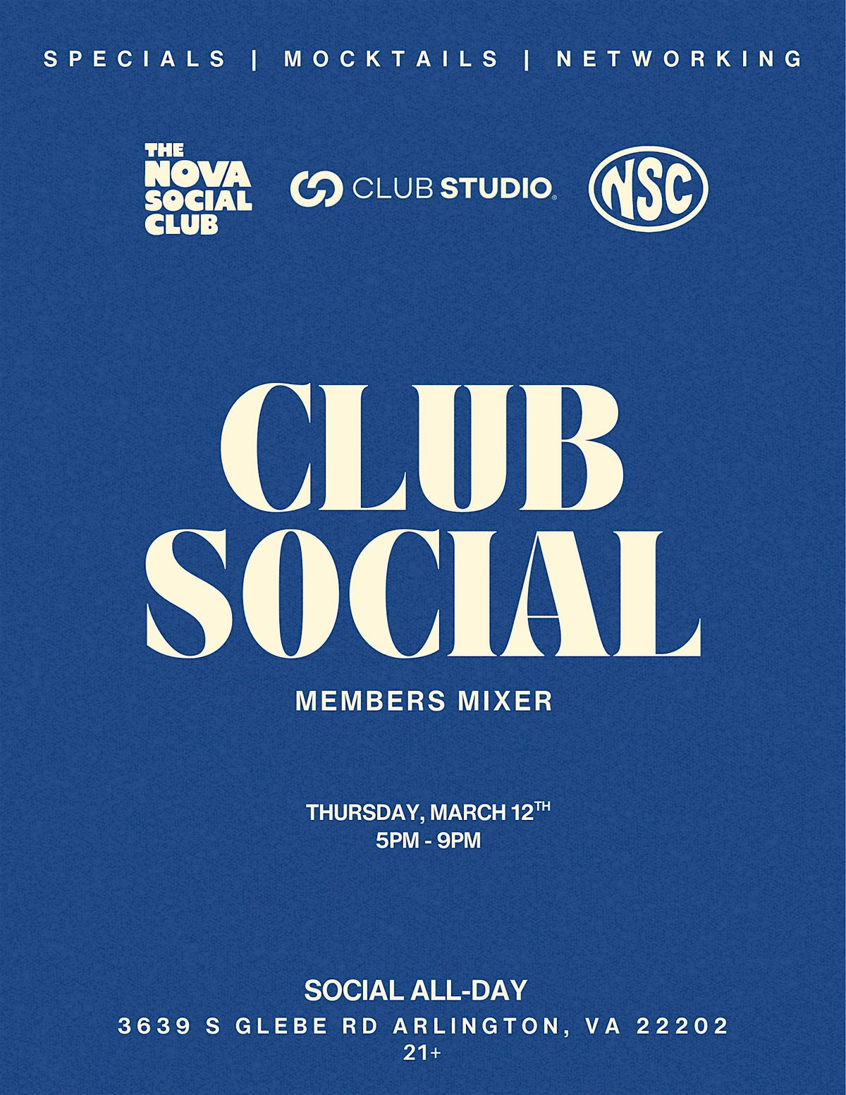 Grab a friend and get together with The NOVA Social Club x Club Studio to network, mix, mingle & socialize. We're bringing you "Club Studio" on Thursday, March 12th at Social All Day Bar because we understand the importance of community, growing your network, and resources.
