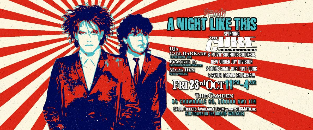 A NIGHT LIKE THIS is no ordinary Cure party. While others spin a “bit of everything,” we go deep. From the classics to the rare gems, B-SIDES & live favourites, our DJs have taken Cure nights around the world — NEW YORK CITY, PARIS, LONDON, GLASGOW, CARDIFF, EDINBURGH — and now WE'RE BRINGING THE PARTY HOME to LONDON!! 🔥🔥🔥This party also doubles up as a CHAMELEONS Aftershow Party being just across the road from their London show at Camden Koko! All the bands will be invited to join the party so expect an all-night journey through: THE CURE (hits + deep cuts all night) plus Dark post-punk, goth & synth anthems from CHAMELEONS, Depeche Mode, BAUHAUS , Joy Division, SIOUXSIE , Sisters of Mercy, THE MISSION , Gary Numan, COCTEAU TWINS & much much more!!!