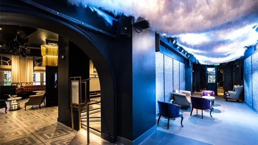 This is a sleek and glam getaway in the heart of Dupont Circle, with Instagram-worthy details. A quartz-topped main bar, a grand chandelier made up of half a mile of custom gold chain links, a dramatic staircase, and ceiling tulle sculpture round out the two-story clubhouse. Swatchroom restored the historical landmark’s 12-foot soaring arched windows and classic vestibule with period mosaic tile.