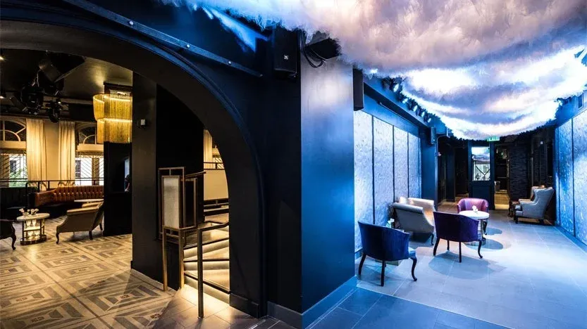 This is a sleek and glam getaway in the heart of Dupont Circle, with Instagram-worthy details. A quartz-topped main bar, a grand chandelier made up of half a mile of custom gold chain links, a dramatic staircase, and ceiling tulle sculpture round out the two-story clubhouse. Swatchroom restored the historical landmark’s 12-foot soaring arched windows and classic vestibule with period mosaic tile.