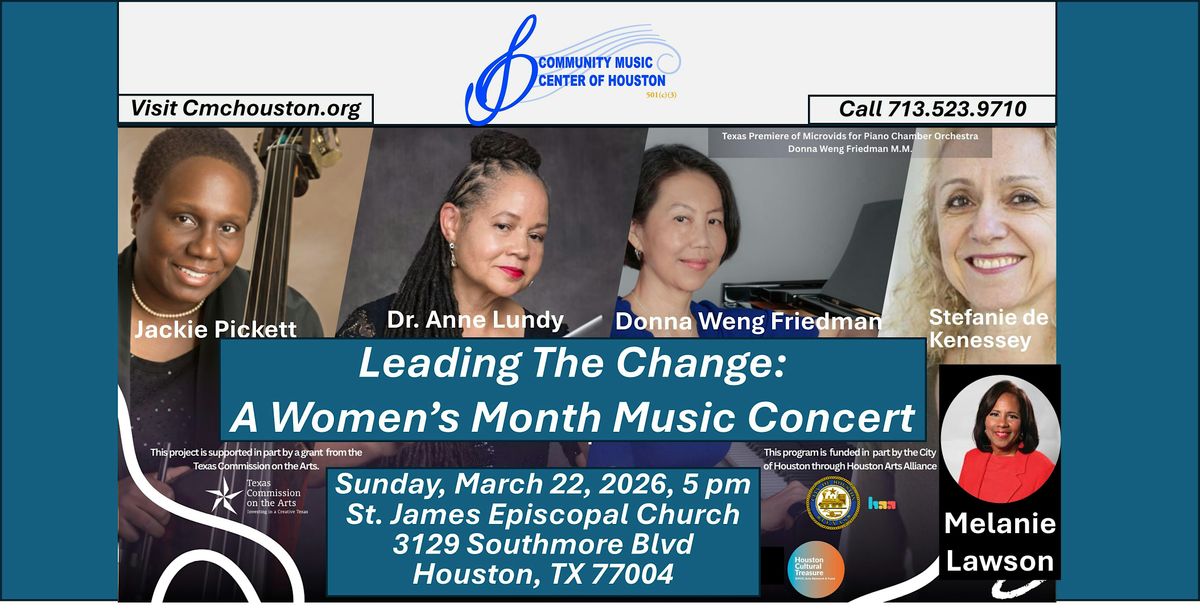 Join CMCH, Dr. Anne Lundy, and Houston Icon Melanie Lawson for the CMCH Women's History Month Concert, a lively in-person event showcasing the power and creativity of women in music! Come enjoy uplifting performances by the Scott Joplin Chamber Orchestra, connect with amazing people, and soak up the positive vibes. It’s all about fun, inspiration, and honoring women’s achievements. Don’t miss out on this awesome celebration – bring your friends and get ready to have a great time!