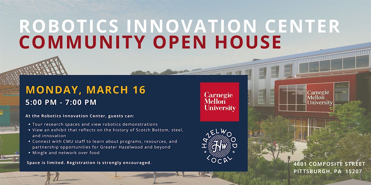 Join Carnegie Mellon University and Hazelwood Local for an all ages Community Open House at the Robotics Innovation Center in Hazelwood showcasing worldclass research & innovation, community engagement, and sustability.