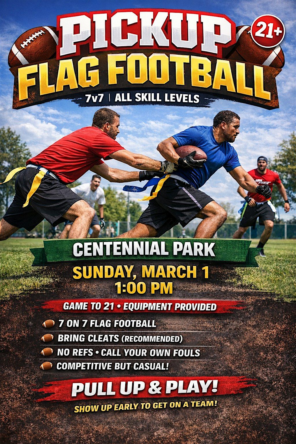 Pickup-style coed 7v7 flag football for adults 21+ at Centennial Park. Competitive but casual games to 21 points with all equipment providedAbout this Event
