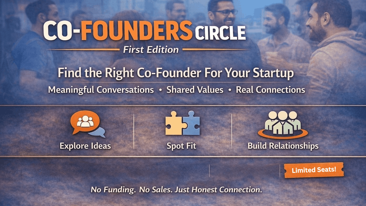 Finding the right co-founder is one of the most important decisions for any startup.Co-Founders Circle is a safe space for builders to connect, explore partnerships, and find the right co-founder match .4:00 PM - Welcome note & Ice-breakers.4:10 PM - Quick intros: Who you are & what you’re building.4:25 PM - Open mic: Pitch your co-founder needs.4:45 PM - Focused 1-on-1 "Deep Dive" conversations.5:15 PM - Free-flow collaboration & idea sharing.6:00 PM - Group Pic / Open for Networking / Wrap Up!--------------------------------------------------------------------------------------------------------------------------------------------------------------iDoneSEO is a Digital Marketing Community. It hosts summits, workshops, and networking meets to connect Startups, Marketers, and Creators for learning and professional growth and to build the local digital ecosystem.