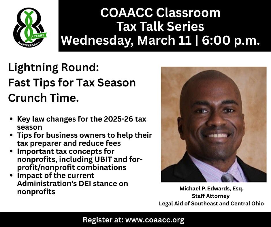 Don’t miss our Tax Talk Series hosted by Michael P. Edwards, Esq., Staff Attorney at Legal Aid of Southeast and Central Ohio. The Series begins March 11 at 6pm with “Lightning Round: Fast Tips for Tax Season Crunch Time.”
