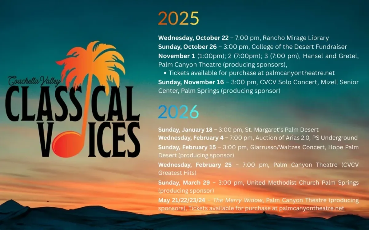 🌟 Step into a world of wonder at Coachella Valley Classical Voices at Plaza Theatre - Palm Springs, where extraordinary moments await! 🏛️ Located at Plaza Theatre - Palm Springs in dynamic Palm Springs, CA, this event will become the talk of the town. 📅 Join us on August 23rd, 2026 at 03:00 PM for a celebration that defies the ordinary. ✨ This curated experience brings together the best of entertainment, culture, and community spirit. Every detail has been thoughtfully planned to ensure an unforgettable experience for all our guests. 🎯 Take advantage of this opportunity to be part of something special. 🎊 Early registration is recommended as space is limited!